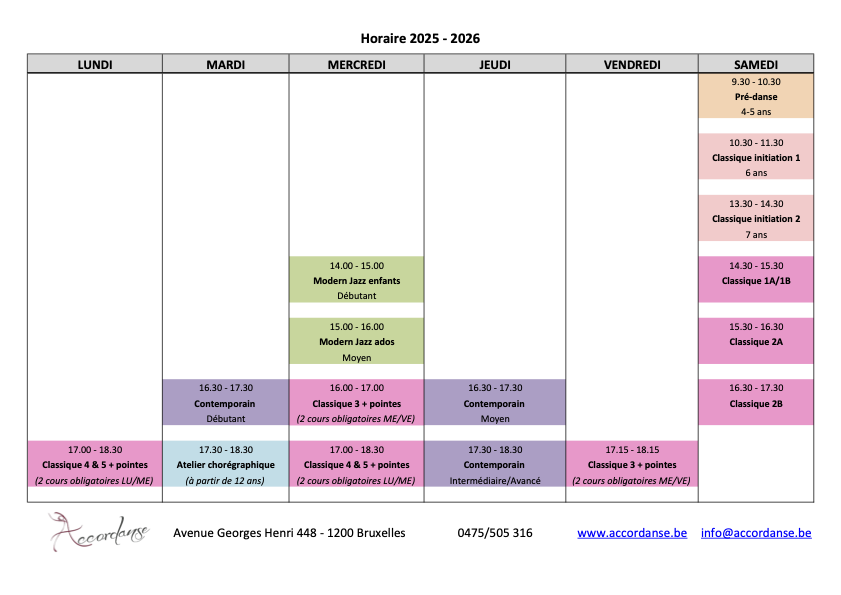 | Classique 4 & 5 + pointes | Mercredi | 17.00-18.30 | 15 ans et + |